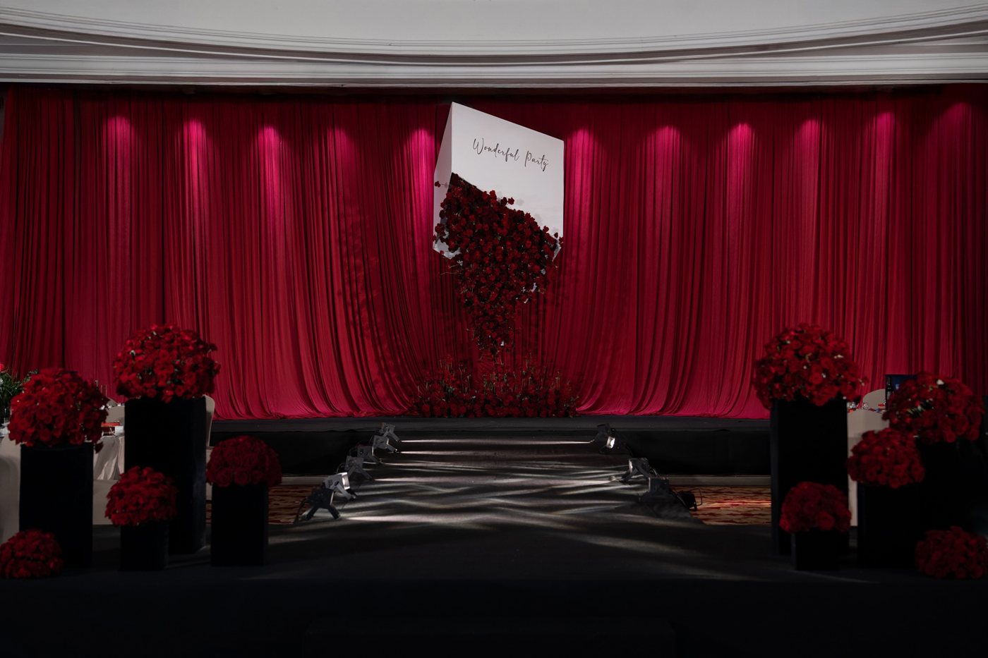 2022.10.17玫红色概念轻奢婚礼 玫红色与沉稳的黑色相互碰撞 营造出前卫高级的视觉效果 深层次拓展延伸的剧院结构 配上层层叠叠的帷幔|隆重而不失大气活力 柔美的光线搭配白色粉色系簇拥的鲜花|让整场设计更加自然浪漫 酒店|东百假日 [更多…]